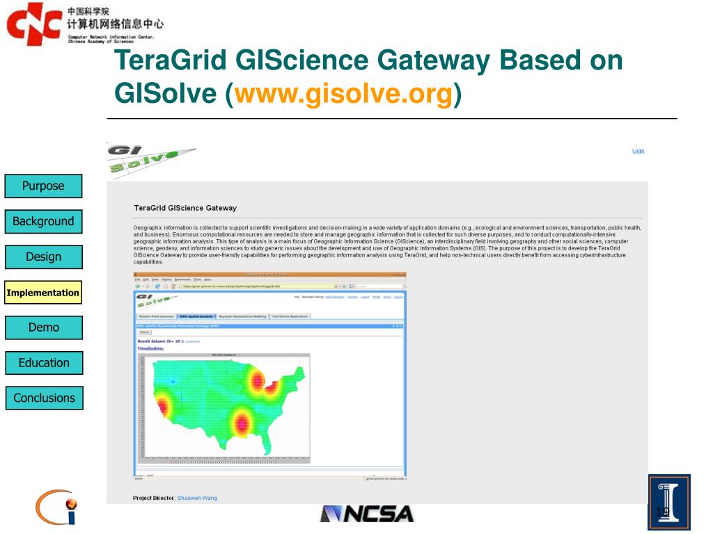 TeraGrid GIScience Gateway Based on GISolve (www.gisolve.org) Purpose Background Design Implementation Demo Education Conclusions