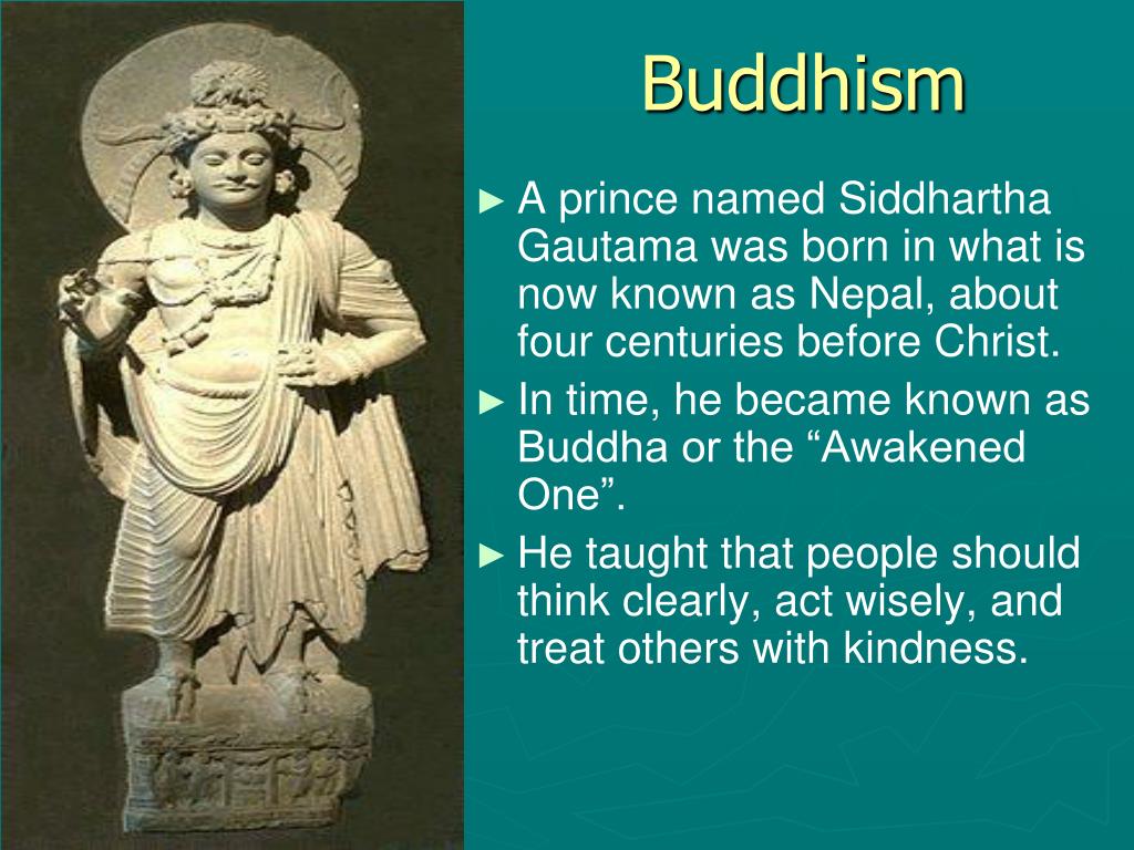Buddhism • A prince named Siddhartha Gautama was born in what is now known as Nepal, about four centuries before Christ. • In time, he became known as Buddha or the “Awakened One”. • He taught that people should think clearly, act wisely, and treat others with kindness.