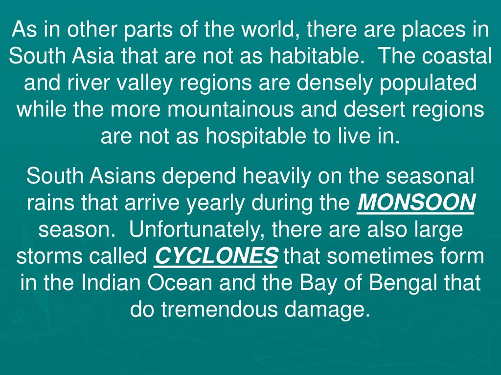 As in other parts of the world, there are places in South Asia that are not as habitable. The coastal and river valley regions are densely populated while the more mountainous and desert regions are not as hospitable to live in. South Asians depend heavily on the seasonal rains that arrive yearly during the MONSOON season. Unfortunately, there are also large storms called CYCLONES that sometimes form in the Indian Ocean and the Bay of Bengal that do tremendous damage.