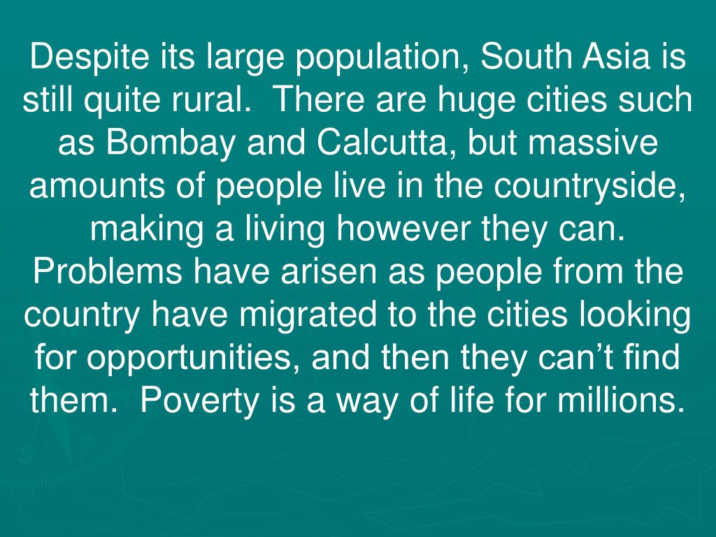 Despite its large population, South Asia is still quite rural. There are huge cities such as Bombay and Calcutta, but massive amounts of people live in the countryside, making a living however they can. Problems have arisen as people from the country have migrated to the cities looking for opportunities, and then they can’t find them. Poverty is a way of life for millions.