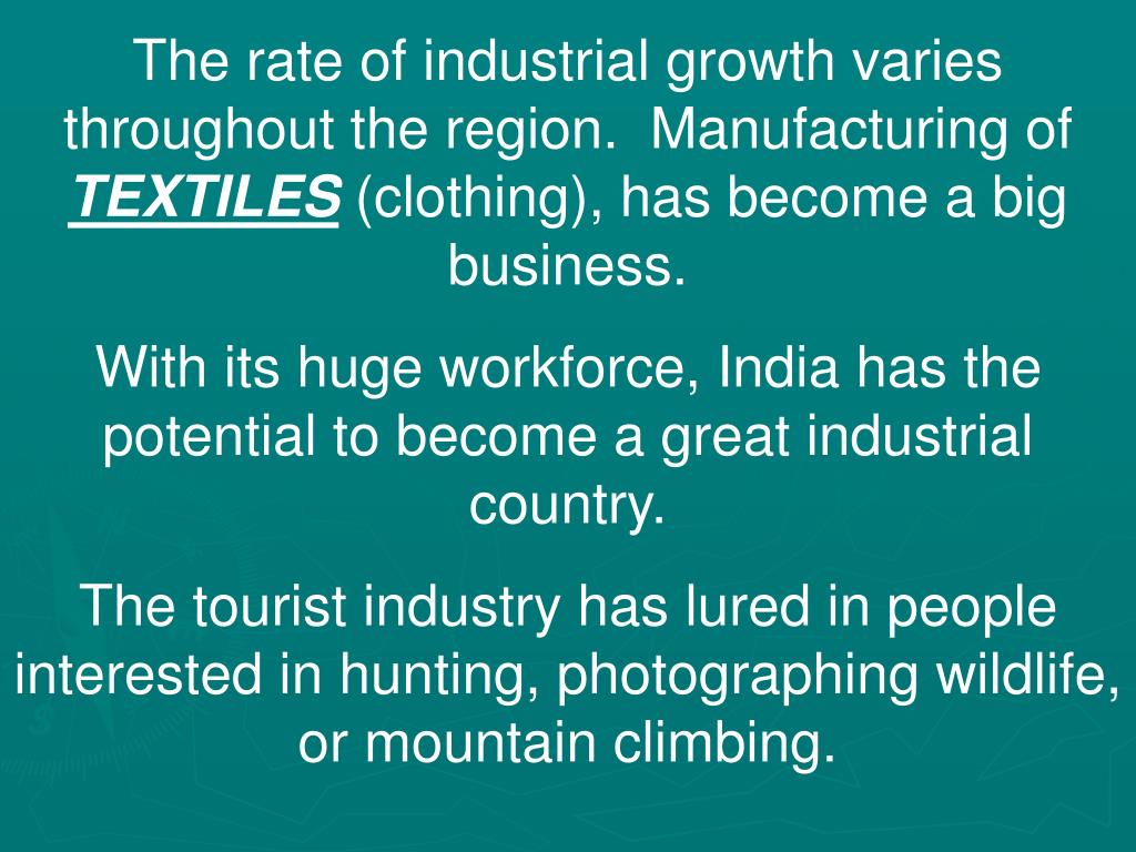 The rate of industrial growth varies throughout the region. Manufacturing of TEXTILES (clothing), has become a big business. With its huge workforce, India has the potential to become a great industrial country. The tourist industry has lured in people interested in hunting, photographing wildlife, or mountain climbing.