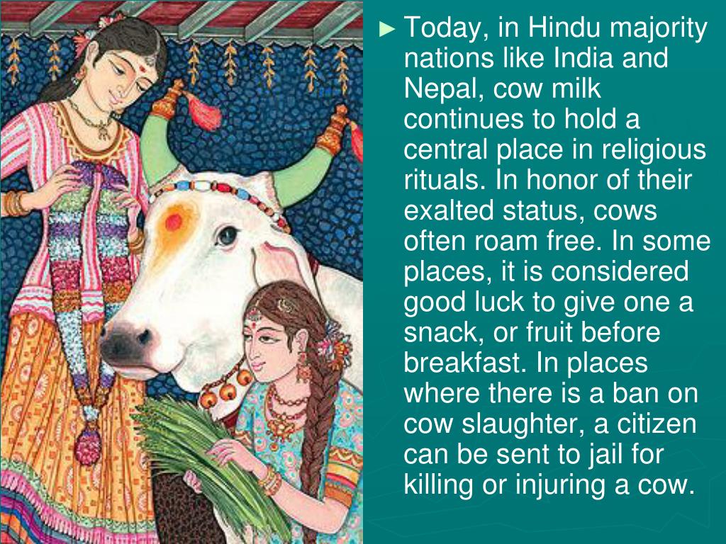 Today, in Hindu majority nations like India and Nepal, cow milk continues to hold a central place in religious rituals. In honor of their exalted status, cows often roam free. In some places, it is considered good luck to give one a snack, or fruit before breakfast. In places where there is a ban on cow slaughter, a citizen can be sent to jail for killing or injuring a cow.