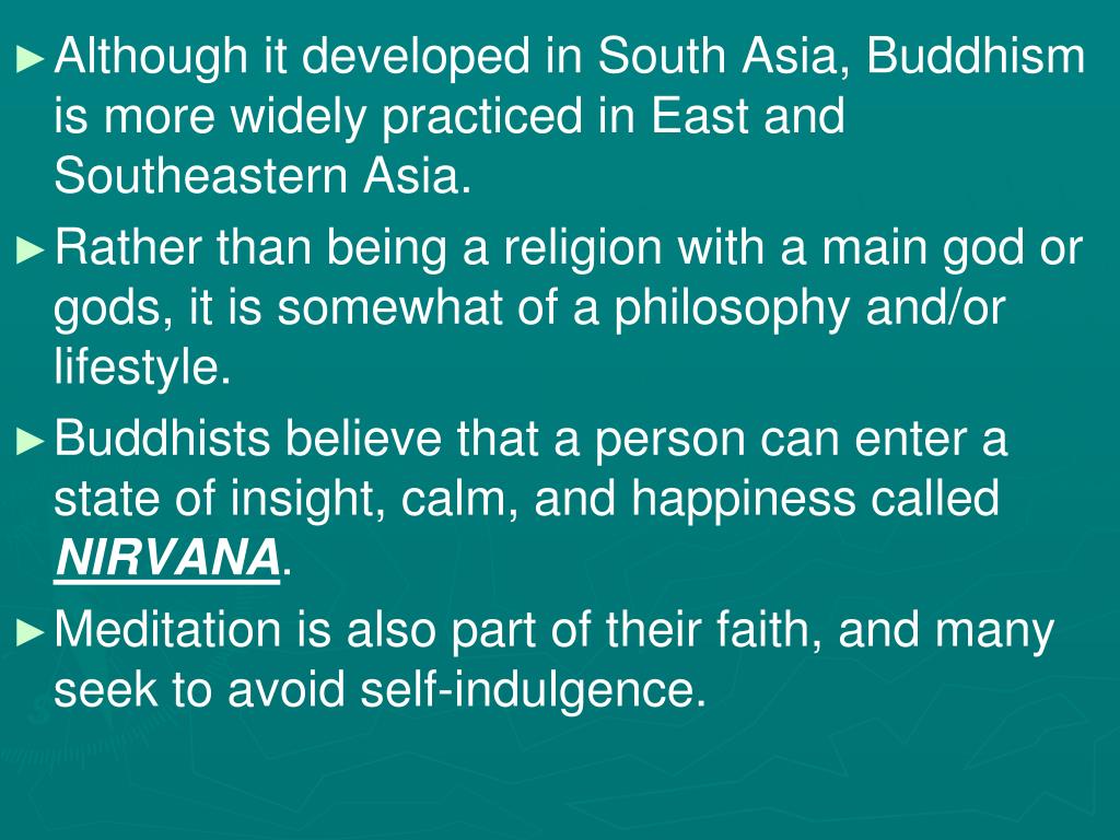 Although it developed in South Asia, Buddhism is more widely practiced in East and Southeastern Asia. • Rather than being a religion with a main god or gods, it is somewhat of a philosophy and/or lifestyle. • Buddhists believe that a person can enter a state of insight, calm, and happiness called NIRVANA. • Meditation is also part of their faith, and many seek to avoid self-indulgence.