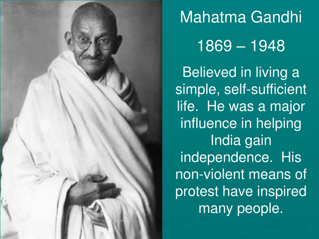 Mahatma Gandhi 1869 – 1948 Believed in living a simple, self-sufficient life. He was a major influence in helping India gain independence. His non-violent means of protest have inspired many people.