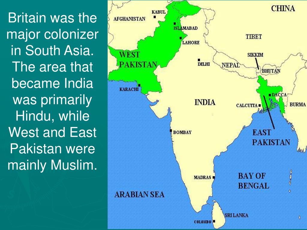 Britain was the major colonizer in South Asia. The area that became India was primarily Hindu, while West and East Pakistan were mainly Muslim.