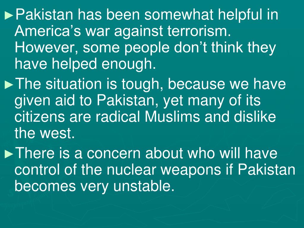 Pakistan has been somewhat helpful in America’s war against terrorism. However, some people don’t think they have helped enough. • The situation is tough, because we have given aid to Pakistan, yet many of its citizens are radical Muslims and dislike the west. • There is a concern about who will have control of the nuclear weapons if Pakistan becomes very unstable.