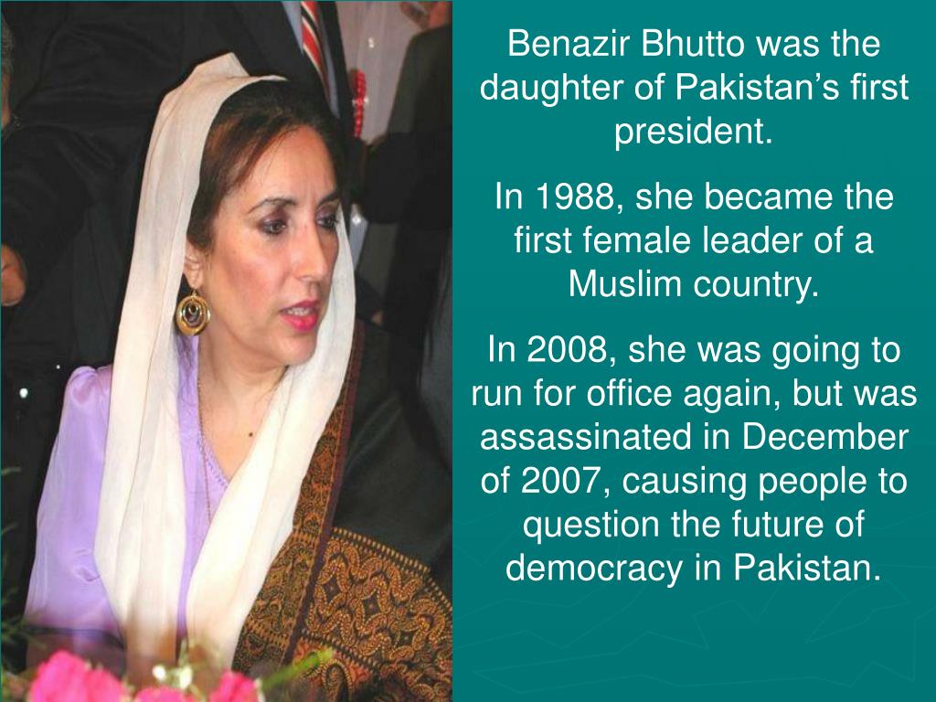 Benazir Bhutto was the daughter of Pakistan’s first president. In 1988, she became the first female leader of a Muslim country. In 2008, she was going to run for office again, but was assassinated in December of 2007, causing people to question the future of democracy in Pakistan.