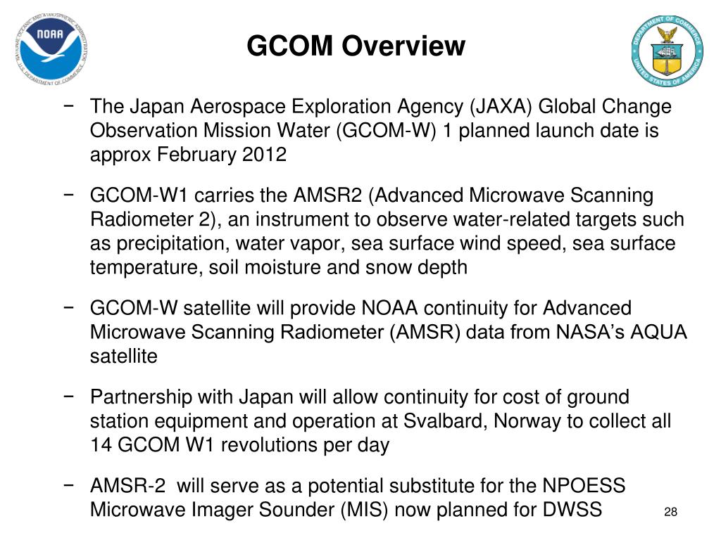 GCOM Overview 28 • The Japan Aerospace Exploration Agency (JAXA) Global Change Observation Mission Water (GCOM-W) 1 planned launch date is approx February 2012 • GCOM-W1 carries the AMSR2 (Advanced Microwave Scanning Radiometer 2), an instrument to observe water-related targets such as precipitation, water vapor, sea surface wind speed, sea surface temperature, soil moisture and snow depth • GCOM-W satellite will provide NOAA continuity for Advanced Microwave Scanning Radiometer (AMSR) data from NASA’s AQUA satellite • Partnership with Japan will allow continuity for cost of ground station equipment and operation at Svalbard, Norway to collect all 14 GCOM W1 revolutions per day • AMSR-2 will serve as a potential substitute for the NPOESS Microwave Imager Sounder (MIS) now planned for DWSS