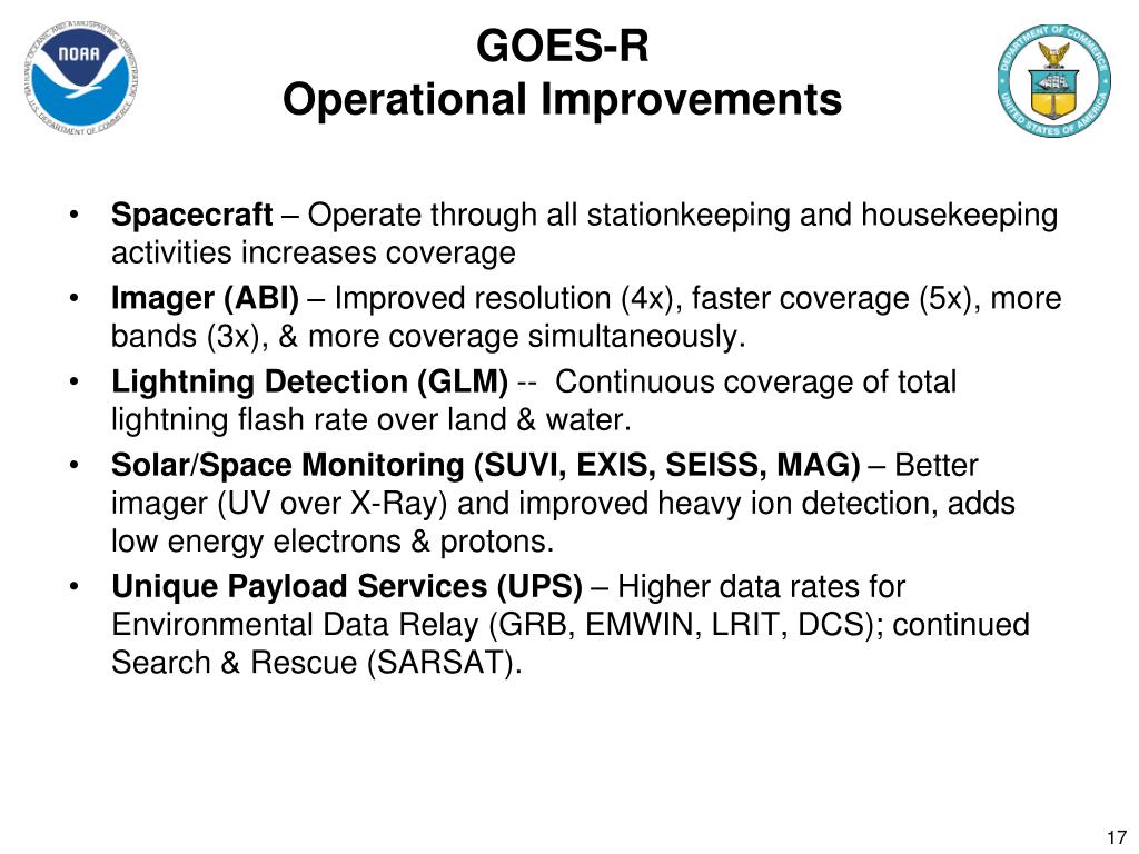GOES-R Operational Improvements • Spacecraft – Operate through all stationkeeping and housekeeping activities increases coverage • Imager (ABI) – Improved resolution (4x), faster coverage (5x), more bands (3x), & more coverage simultaneously. • Lightning Detection (GLM) -- Continuous coverage of total lightning flash rate over land & water. • Solar/Space Monitoring (SUVI, EXIS, SEISS, MAG) – Better imager (UV over X-Ray) and improved heavy ion detection, adds low energy electrons & protons. • Unique Payload Services (UPS) – Higher data rates for Environmental Data Relay (GRB, EMWIN, LRIT, DCS); continued Search & Rescue (SARSAT).