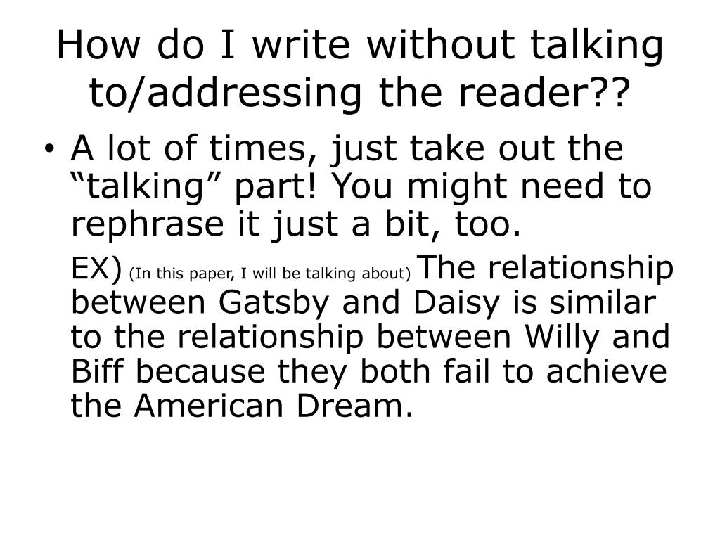 How do I write without talking to/addressing the reader?? • A lot of times, just take out the “talking” part! You might need to rephrase it just a bit, too. EX) (In this paper, I will be talking about) The relationship between Gatsby and Daisy is similar to the relationship between Willy and Biff because they both fail to achieve the American Dream.