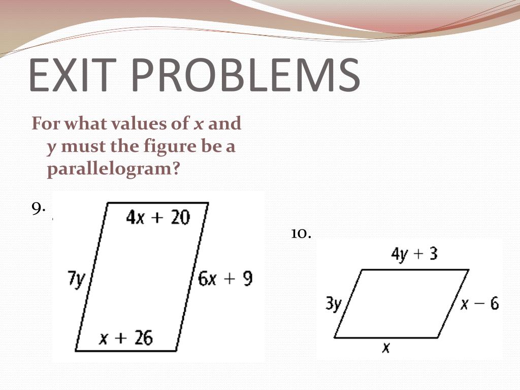 EXIT PROBLEMS For what values of x and y must the figure be a parallelogram? 9. 10.