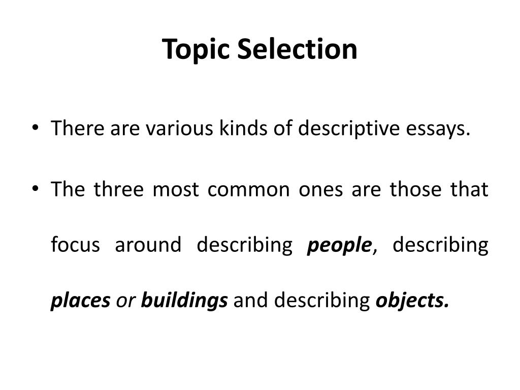 Topic Selection • There are various kinds of descriptive essays. • The three most common ones are those that focus around describing people, describing places or buildings and describing objects.