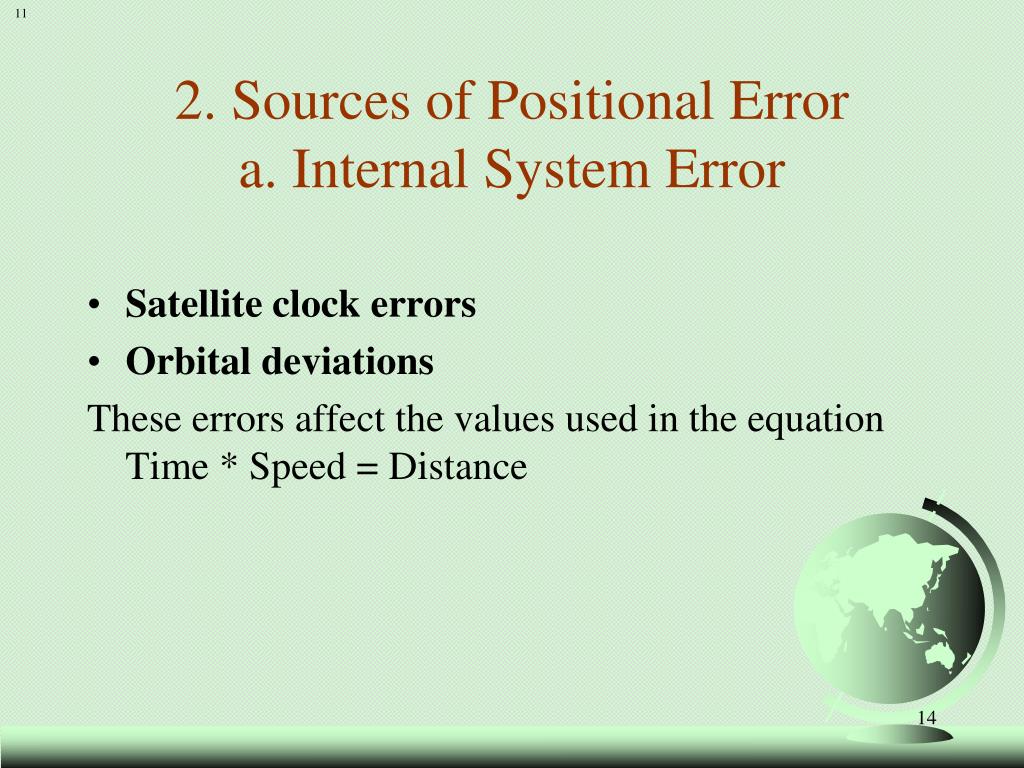 11 2. Sources of Positional Errora. Internal System Error • Satellite clock errors • Orbital deviations These errors affect the values used in the equation Time * Speed = Distance