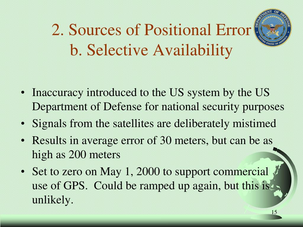 2. Sources of Positional Error a. Internal System Error b. Selective Availability c. Signal Interference d. Satellite Geometry e. User Innocence