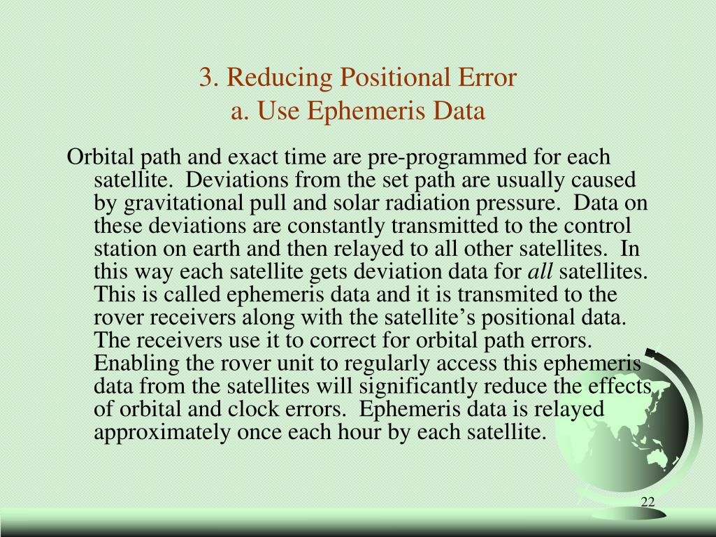 Orbital path and exact time are pre-programmed for each satellite. Deviations from the set path are usually caused by gravitational pull and solar radiation pressure. Data on these deviations are constantly transmitted to the control station on earth and then relayed to all other satellites. In this way each satellite gets deviation data for all satellites. This is called ephemeris data and it is transmited to the rover receivers along with the satellite’s positional data. The receivers use it to correct for orbital path errors. Enabling the rover unit to regularly access this ephemeris data from the satellites will significantly reduce the effects of orbital and clock errors. Ephemeris data is relayed approximately once each hour by each satellite. 3. Reducing Positional Error a. Use Ephemeris Data