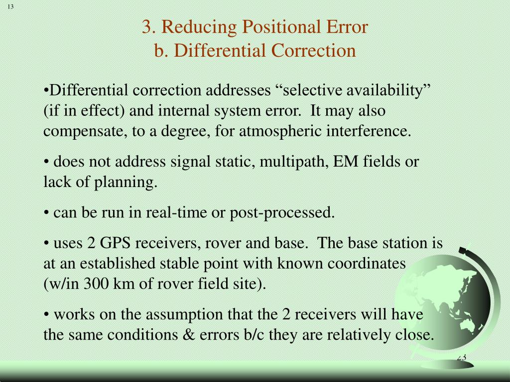 Sources of Differential Correction Data All methods are not equal in the degree to which they can correct field data. The results for any one system can vary depending on the distance to the correction source and other factors beyond the user’s control.