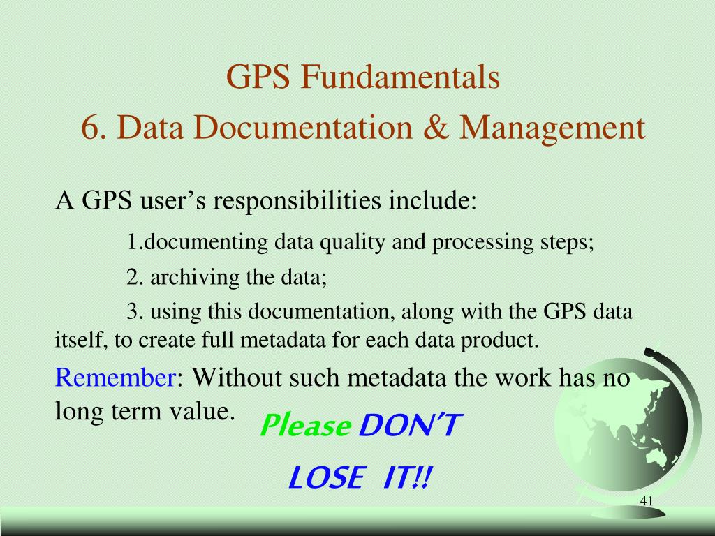 GPS Fundamentals6. Data Documentation & Management A GPS user’s responsibilities include: 1.documenting data quality and processing steps; 2. archiving the data; 3. using this documentation, along with the GPS data itself, to create full metadata for each data product. Remember: Without such metadata the work has no long term value. Please DON’T LOSE IT!!