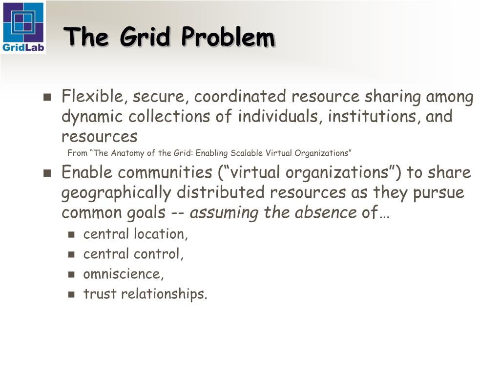 The Grid Problem • Flexible, secure, coordinated resource sharing among dynamic collections of individuals, institutions, and resources From “The Anatomy of the Grid: Enabling Scalable Virtual Organizations” • Enable communities (“virtual organizations”) to share geographically distributed resources as they pursue common goals -- assuming the absence of… • central location, • central control, • omniscience, • trust relationships.