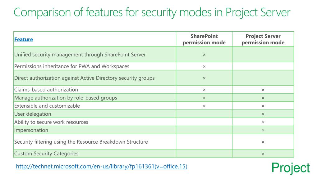 Comparison of features for security modes in Project Server http://technet.microsoft.com/en-us/library/fp161361(v=office.15)