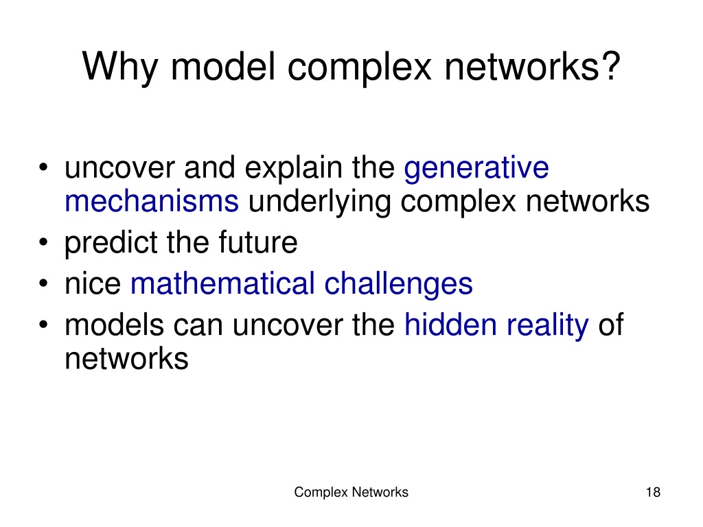 Why model complex networks? • uncover and explain the generative mechanisms underlying complex networks • predict the future • nice mathematical challenges • models can uncover the hidden reality of networks Complex Networks