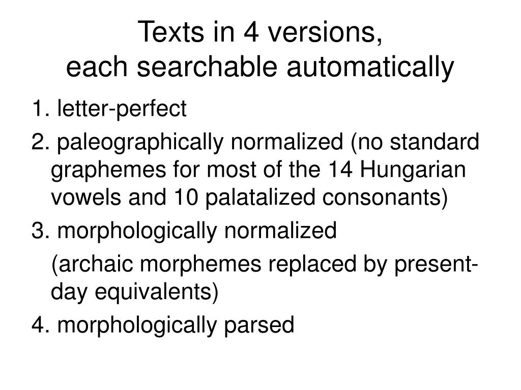 Texts in 4 versions, each searchable automatically 1. letter-perfect 2. paleographically normalized (no standard graphemes for most of the 14 Hungarian vowels and 10 palatalized consonants) 3. morphologically normalized (archaic morphemes replaced by present-day equivalents) 4. morphologically parsed