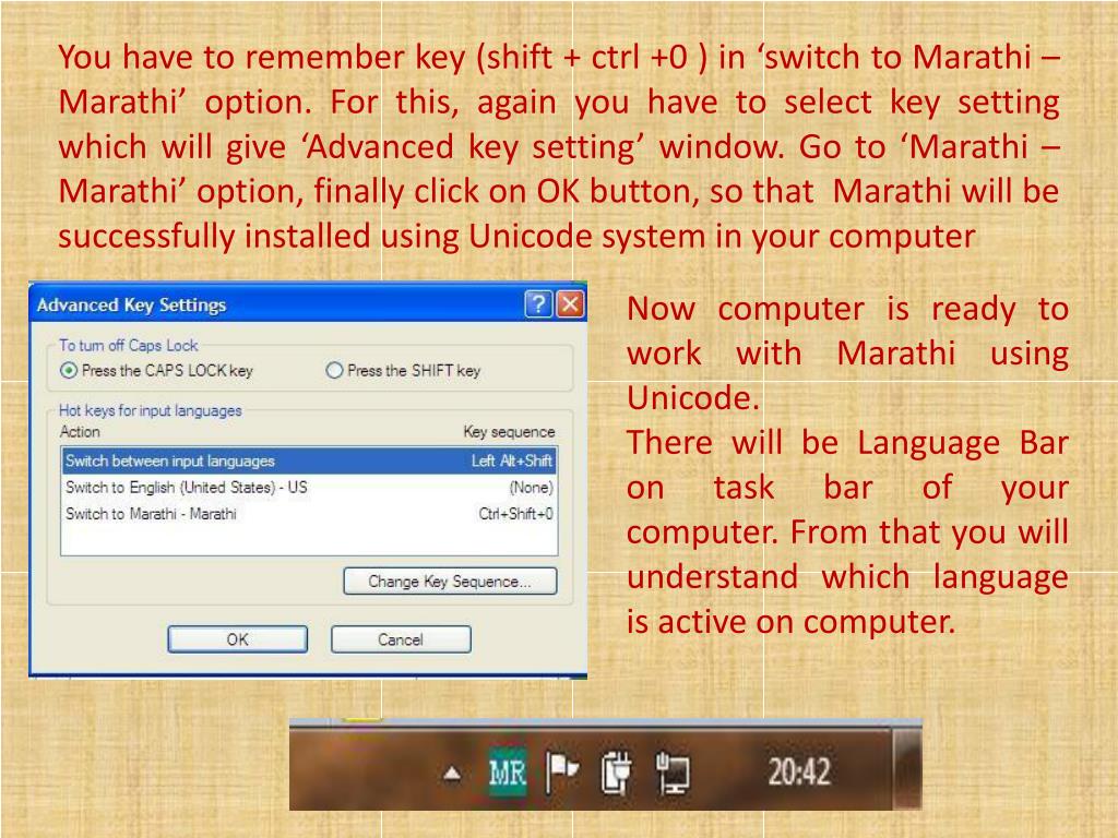 You have to remember key (shift + ctrl +0 ) in ‘switch to Marathi – Marathi’ option. For this, again you have to select key setting which will give‘Advanced key setting’ window. Go to ‘Marathi – Marathi’ option, finally click on OK button, so that Marathi will be successfully installed using Unicode system in your computer Now computer is ready to work with Marathi using Unicode. There will be Language Bar on task bar of your computer. From that you will understand which language is active on computer.