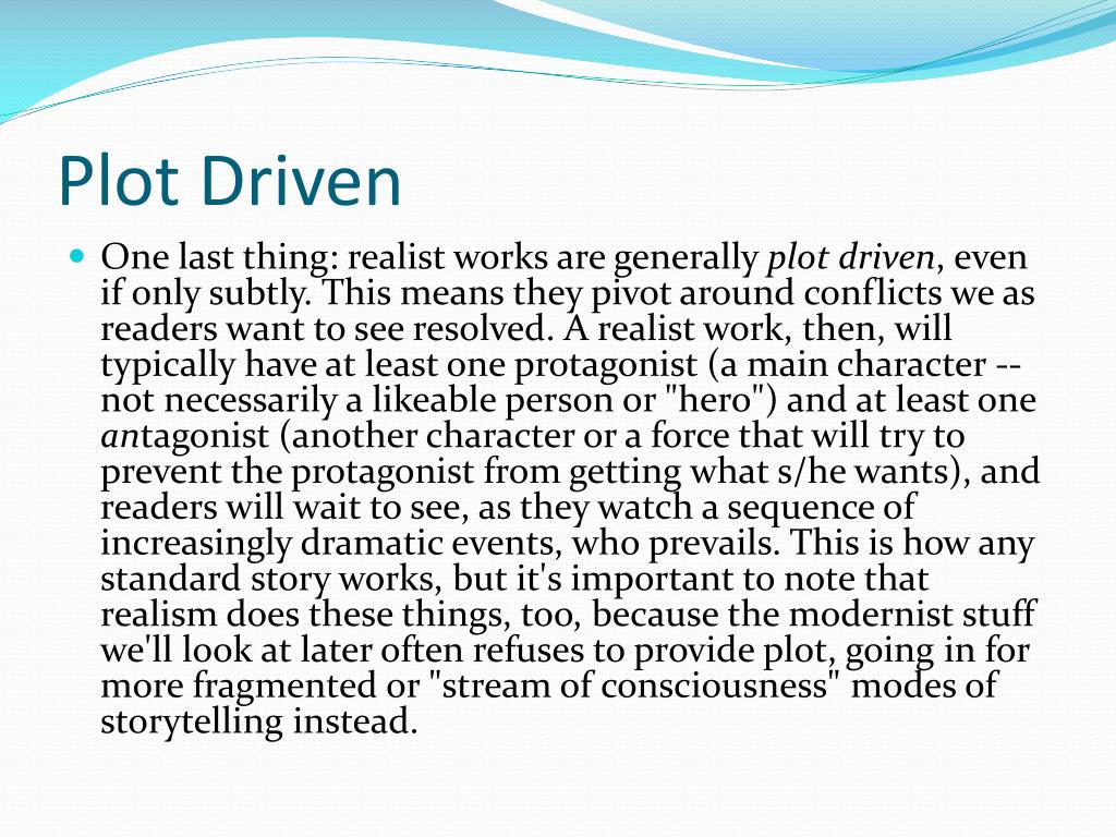 Plot Driven • One last thing: realist works are generally plot driven, even if only subtly. This means they pivot around conflicts we as readers want to see resolved. A realist work, then, will typically have at least one protagonist (a main character -- not necessarily a likeable person or "hero") and at least one antagonist (another character or a force that will try to prevent the protagonist from getting what s/he wants), and readers will wait to see, as they watch a sequence of increasingly dramatic events, who prevails. This is how any standard story works, but it's important to note that realism does these things, too, because the modernist stuff we'll look at later often refuses to provide plot, going in for more fragmented or "stream of consciousness" modes of storytelling instead.