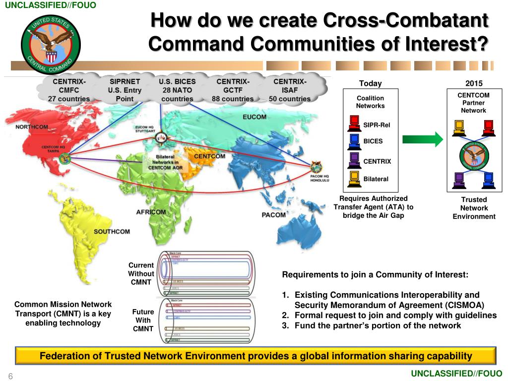UNCLASSIFIED//FOUO How do we create Cross-Combatant Command Communities of Interest? Today 2015 CENTCOM Partner Network Coalition Networks SIPR-Rel BICES CENTRIX Bilateral Requires Authorized Transfer Agent (ATA) to bridge the Air Gap Trusted Network Environment Current Without CMNT • Requirements to join a Community of Interest: • Existing Communications Interoperability and Security Memorandum of Agreement (CISMOA) • Formal request to join and comply with guidelines • Fund the partner’s portion of the network Common Mission Network Transport (CMNT) is a key enabling technology Future With CMNT Federation of Trusted Network Environment provides a global information sharing capability UNCLASSIFIED//FOUO