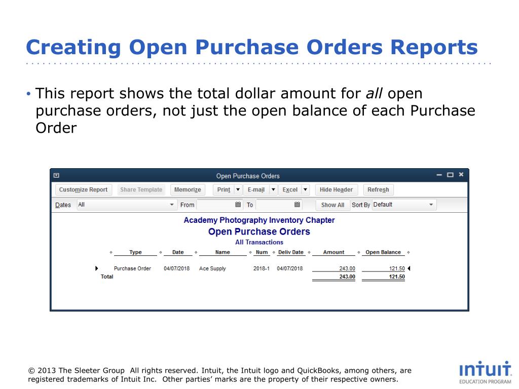 Creating Open Purchase Orders Reports • This report shows the total dollar amount for all openpurchase orders, not just the open balance of each Purchase Order