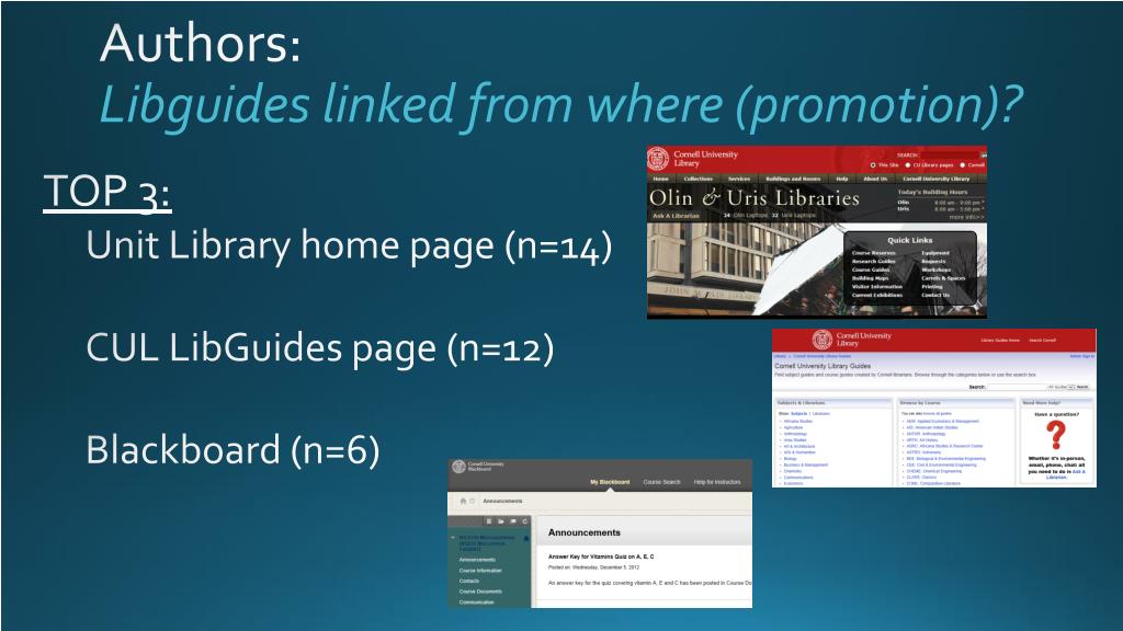 Authors: Libguides linked from where (promotion)? TOP 3: Unit Library home page (n=14) CUL LibGuides page (n=12) Blackboard (n=6)