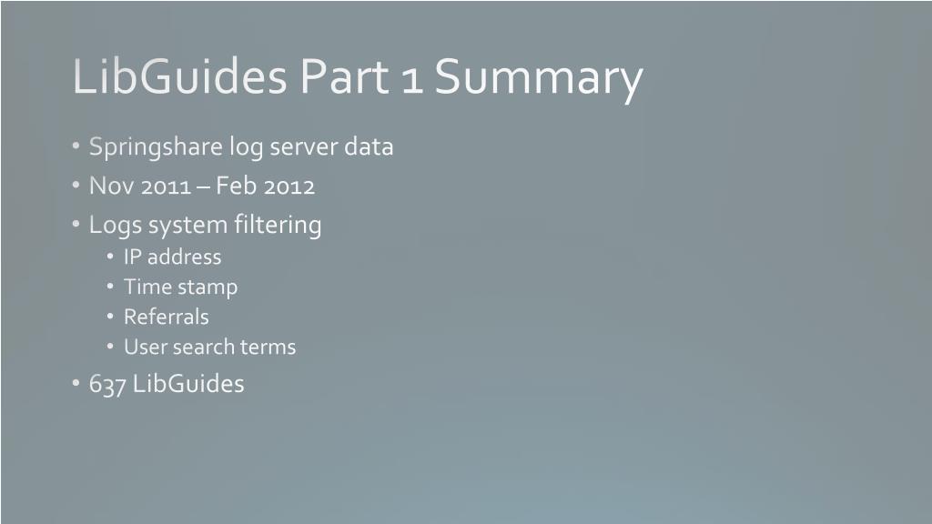 LibGuides Part 1 Summary • Springshare log server data • Nov 2011 – Feb 2012 • Logs system filtering • IP address • Time stamp • Referrals • User search terms • 637 LibGuides
