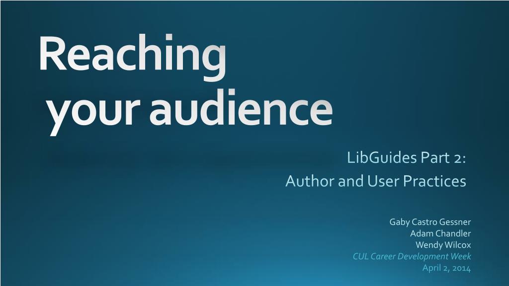 LibGuides Part 2: Author and User Practices Reaching your audience Gaby Castro Gessner Adam Chandler Wendy Wilcox CUL Career Development Week April 2, 2014
