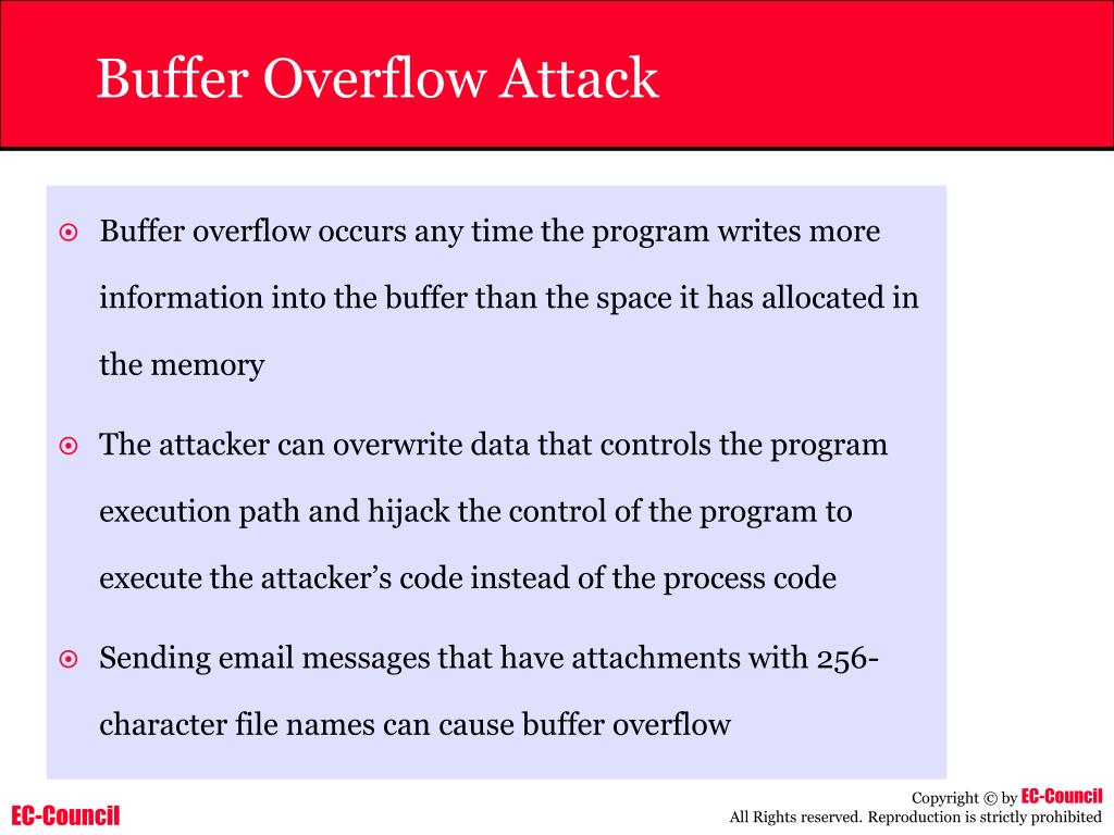 Buffer Overflow Attack • Buffer overflow occurs any time the program writes more information into the buffer than the space it has allocated in the memory • The attacker can overwrite data that controls the program execution path and hijack the control of the program to execute the attacker’s code instead of the process code • Sending email messages that have attachments with 256-character file names can cause buffer overflow