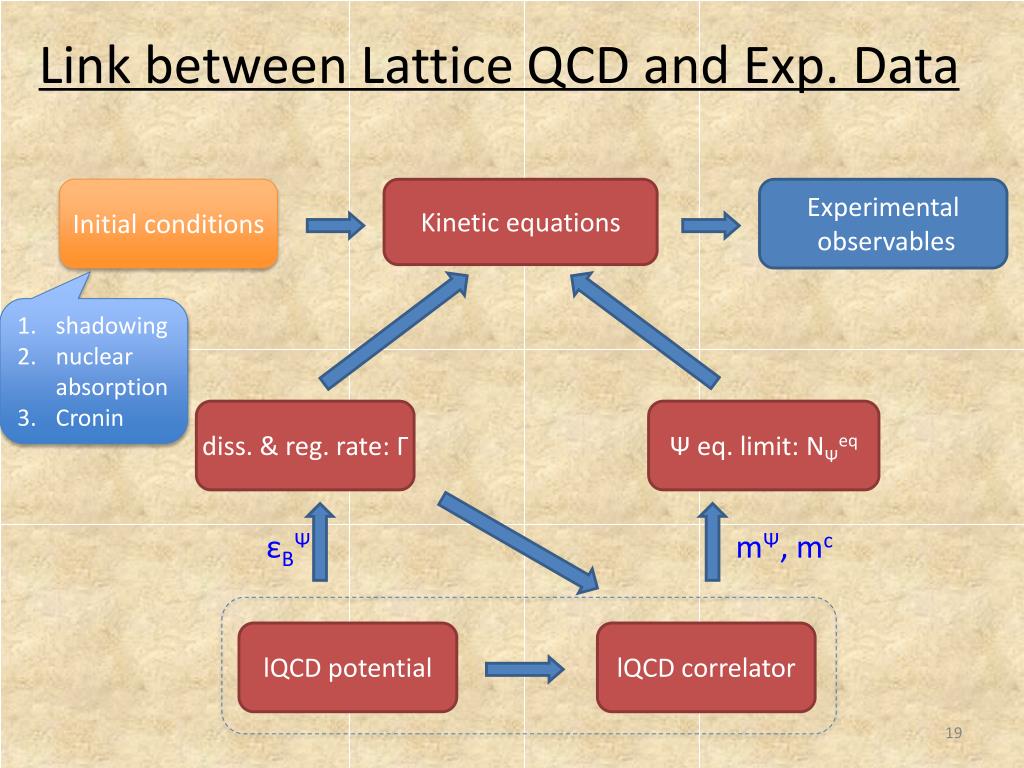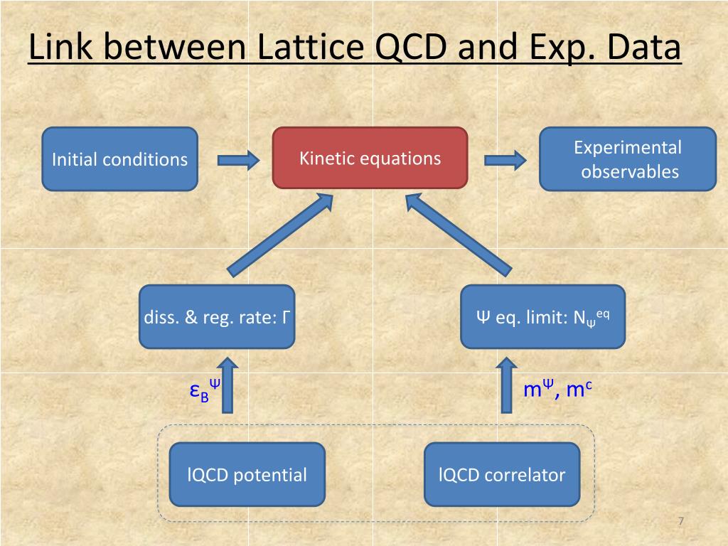 Link between Lattice QCD and Exp. Data Initial conditions Kinetic equations Experimental observables diss. & reg. rate: Γ Ψ eq. limit: NΨeq εBΨ mΨ, mc lQCD potential lQCDcorrelator